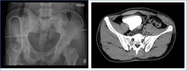 Figure 1. 31-years-old male with polytrauma involving sacral fractures at left S1-3 foramina (Denis zone 2)