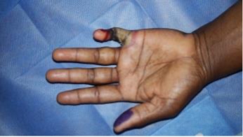 This study was conducted in the department of Plastic Surgery at tertiary care center after getting departmental ethical committee approval. Written informed consent was taken from the patient. The details of the patient are as follows: 40 year old female without any known co morbidities with history of accidental electric burns from low voltage source and sustained circumferential 3rd to 4th degree burns over the left little finger with loss of vascularity of the distal area and 2nd degree burns over the medial aspect of the ring finger in the proximal phalanx (figure 1). Patient underwent little finger disarticulation after 1 week when the line of demarcation was developed and also raw area developed after debridement of the burns over the medial aspect of ring finger (figure 2). Following the procedure, wound dressing was done regularly. She developed a raw area over the medial aspect of her ring finger which did not show any evidence of healing. Wound bed preparation was done for the patient using topical cholecalciferol (figure 3) as her ulcer failed to show any evidence of healing. After debridement of wound, cholecalciferol was applied topically (figure4) over the wound. Over that a non-adherent dressing was kept, and dressings were given. Repeat debridement was done on and cholecalciferol was applied topically every time the dressings were changed. Eight such sessions of cholecalciferol application were done over four weeks.