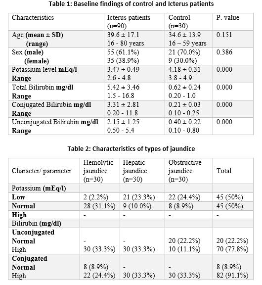 encompassing the Icterus profiles and potassium levels are presented in (Table
