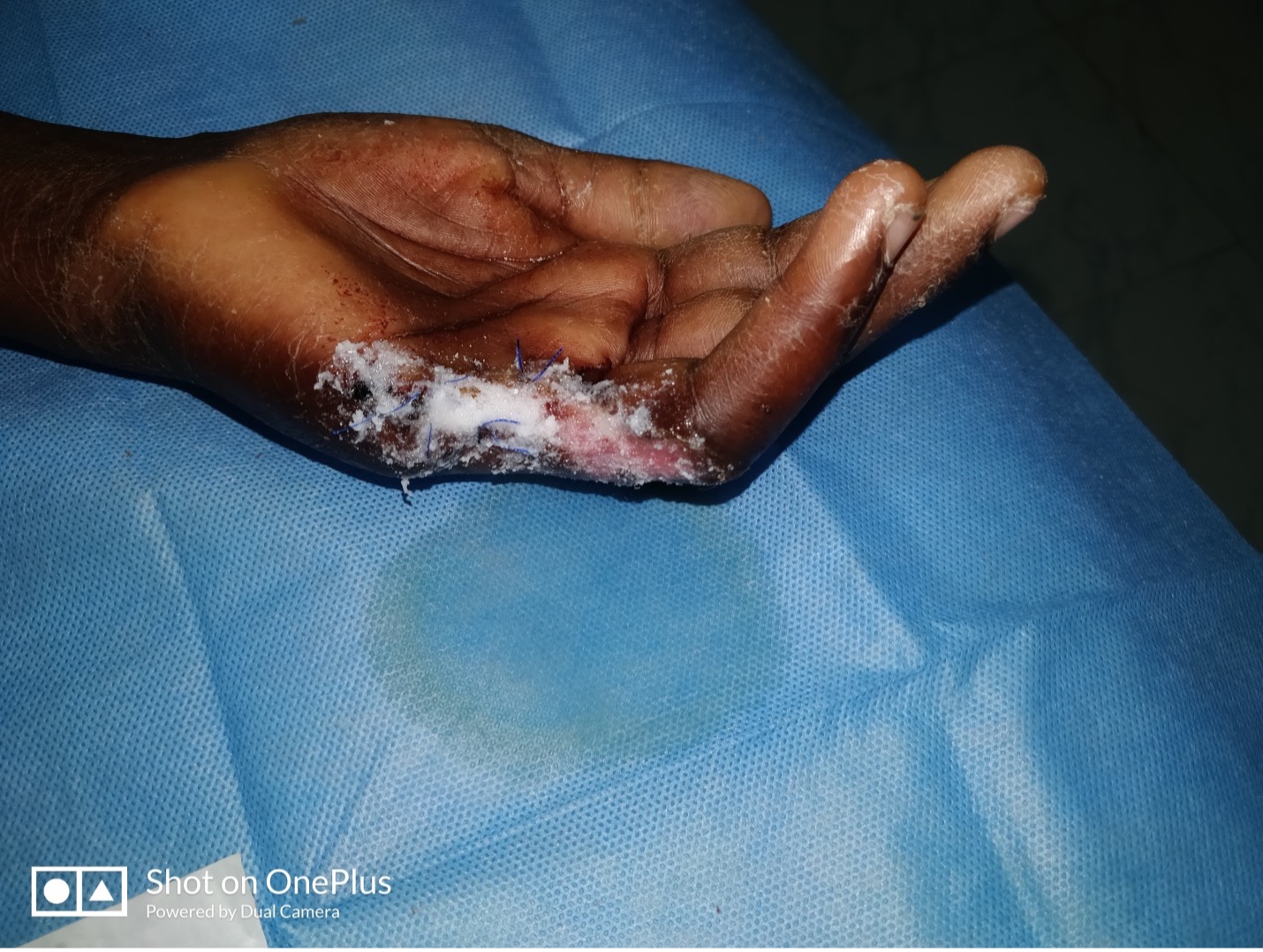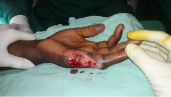 This study was conducted in the department of Plastic Surgery at tertiary care center after getting departmental ethical committee approval. Written informed consent was taken from the patient. The details of the patient are as follows: 40 year old female without any known co morbidities with history of accidental electric burns from low voltage source and sustained circumferential 3rd to 4th degree burns over the left little finger with loss of vascularity of the distal area and 2nd degree burns over the medial aspect of the ring finger in the proximal phalanx (figure 1). Patient underwent little finger disarticulation after 1 week when the line of demarcation was developed and also raw area developed after debridement of the burns over the medial aspect of ring finger (figure 2). Following the procedure, wound dressing was done regularly. She developed a raw area over the medial aspect of her ring finger which did not show any evidence of healing. Wound bed preparation was done for the patient using topical cholecalciferol (figure 3) as her ulcer failed to show any evidence of healing. After debridement of wound, cholecalciferol was applied topically (figure4) over the wound. Over that a non-adherent dressing was kept, and dressings were given. Repeat debridement was done on and cholecalciferol was applied topically every time the dressings were changed. Eight such sessions of cholecalciferol application were done over four weeks.