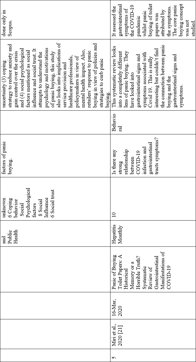 We identified five systematic reviews published in 2020 (n=3) and 2021 (n=2) (Table 2). Among these five articles, two studies discussed the toilet paper hoarding behavior due to the different symptoms of COVID-19 infection [19,21]; two studies assessed the distribution of research conducted on panic buying and potential research gaps [6,18]; and one study systematically assessed the psychological factors of panic buying [20] (Table 2). The number of studies assessed in the systematic reviews varies from 10-53 (Table 2) whilst more recent articles included the maximum number of papers indicating that more articles are coming out during this pandemic [6]. Two articles explained the behavioral perspectives of panic buying [19,21], other two studied the research spectrum of panic buying [6,18], and the rest one discussed the psychological factors of panic buying [20] (Table 2).
