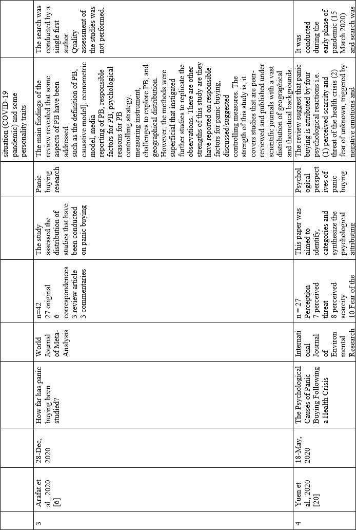 We identified five systematic reviews of panic buying after excluding the duplicates and articles on other variables. The stepwise search details are mentioned in figure 1. The selected review articles were evaluated using the Critical Appraisal Skills Programme Systematic Review Checklist [17]. The quality appraisal findings are presented in table 1. Data were extracted with the help of the Microsoft Excel spreadsheet 2010 version. The extracted variables are presented in table 2.