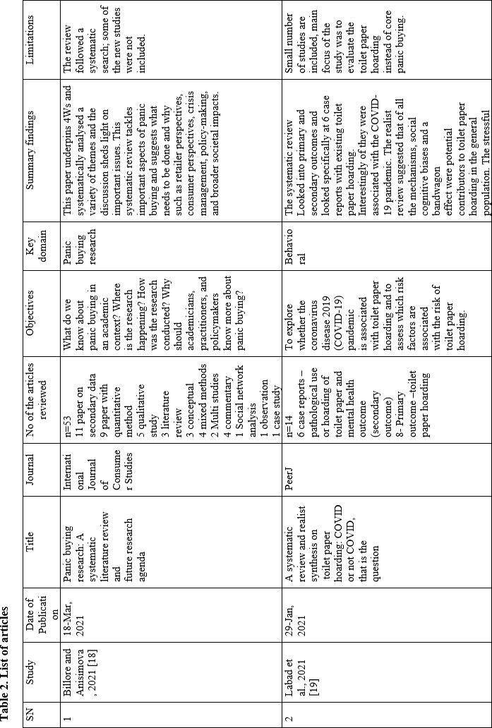 This is the first review of the systematic review on panic buying. However, the review has several limitations. Firstly, it includes articles published in the English language that may exclude some papers. Secondly, panic buying wasn’t the major focus of the two articles. Thirdly, the number of papers is relatively small. Fourthly, the search was performed in the early half of 2021 which may exclude recent systematic reviews.