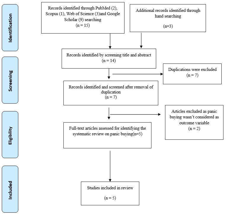 A search was performed in PubMed, Scopus, Web of Science Core Collection, and Google Scholar on June 30, 2021, with the search terms “panic buying”, “systematic review” using the Boolean function ‘and’. The search was also supplemented by hand searching from the reference lists. Initially, at the screening stage, the titles and abstracts were evaluated. Due to lack of clarity from the titles and abstracts, the full-text papers were retrieved for confirmation and subsequently, two researchers assessed the eligibility of the full-text articles for inclusion.