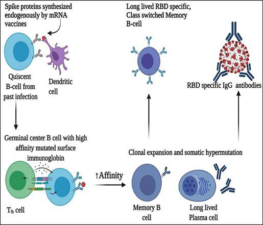 When a single-dose of mRNA vaccine (Pfizer- BNT162b2) was administered to the previously infected individuals, the recall of diverse memory B-cells (CD4+ T-cell dependant instruction by T-follicular helper cells) was observed. The result was the production of cross-variant neutralizing antibodies [19].