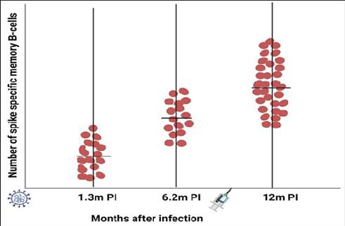Administration of mRNA vaccine 12 months post infection (PI) increased spike specific memory B-cells by 8.6 folds. [As per Wang Z et al., 2021]