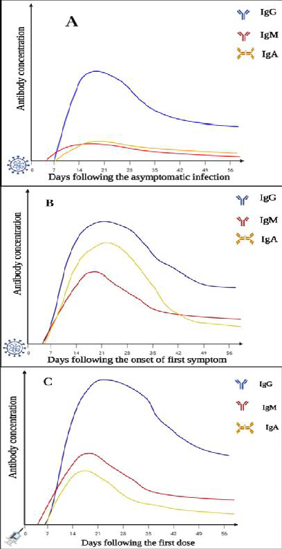 - The IgG antibodies dominate, followed by IgA and IgM after asymptomatic infection.