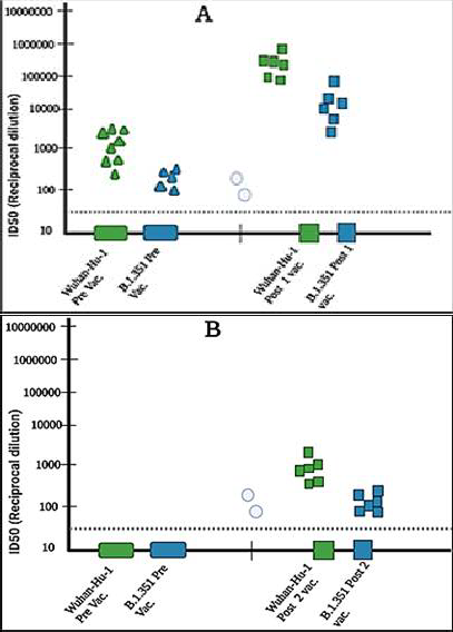 *Antibody titers before vaccination shown in triangle and post vaccination shown in square. The previously infected subjects found seronegative shown as open circles. Dashed lines mark off the lowest serum dilutions tested. [As per Stamatatos et al., 2021]