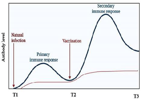 The natural infection triggers the immune response, slow and gradual in onset, producing IgM antibodies as the primary response followed by IgG, which sustains in serum for a modest period. Upon vaccinating the previously infected individuals, the antibody and T-cell response are seen to be much superior, referred to as a secondary immune response, having greater breadth and perpetuity.