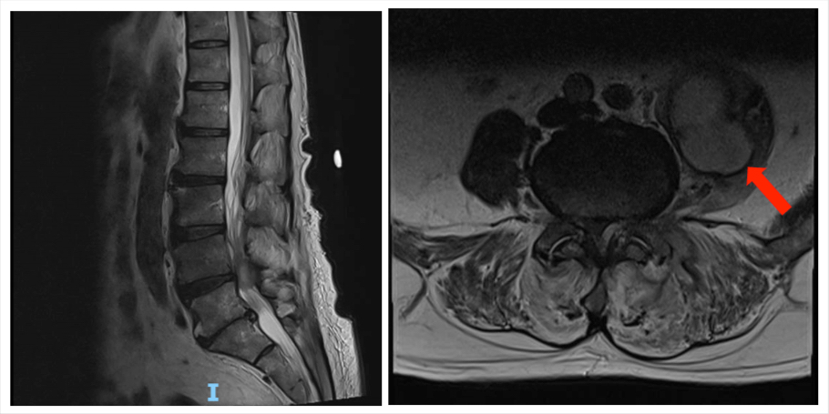 Figure 1. MRI of lumbo-sacral spine showing left facet joint septic arthritis complicated by a 2.4cm left para-facet joint abscess and a 5.1cm left psoas abscess with the extension of the abscess into the L4 and L5 epidural spaces (Red arrow showing psoas abscess)