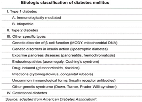 New DM classification was redefined in an ADA’s publication in 1997 and of WHO in 2006. Updated national and international directions recommend DM’s classification in four categories: type 1 DM (DM1), type 2 (DM2), other types and gestational diabetes[19-22].